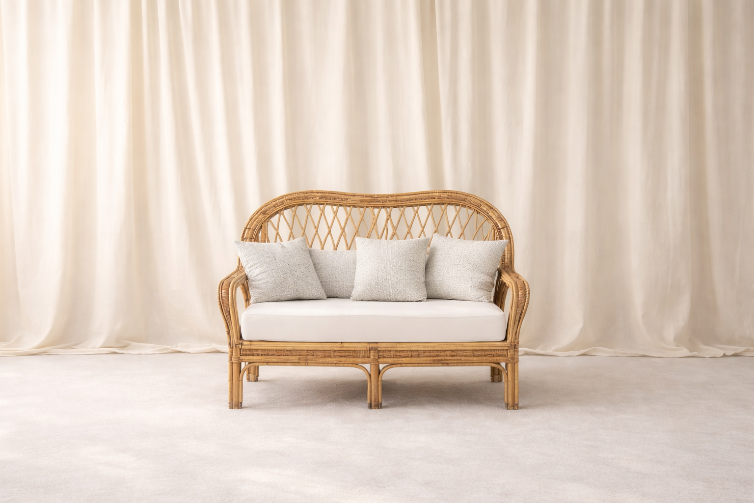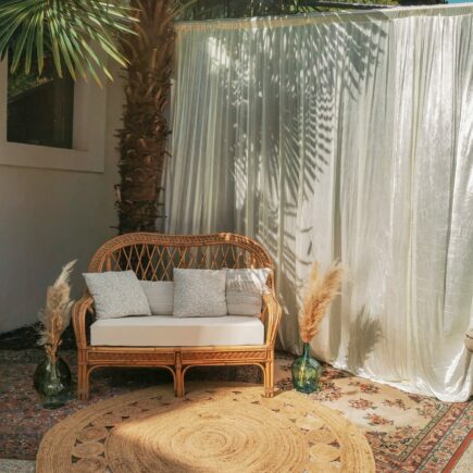 Notre banquette en rotin vintage pour vos réceptions. À utiliser à votre guise en assise de cérémonie, pour créer un coin lounge ou pour un décor de backdrop.
